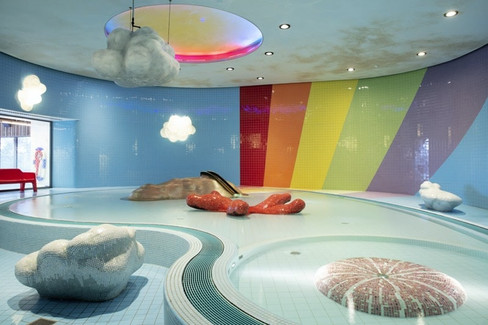 “Här har man valt att satsa på mycket färg vilket vi tycker är roligt. Det finns en stor färggrann regnbåge på väggen och vid regnbågens slut finns en härlig guldskatt på vilken barnen kan åka rutschkana. Man har även byggt ett tredje omklädningsrum som framför allt riktar sig människor med könsneutral identitet eller funktionsvarierade som kanske har ledsagare av annat kön eller människor som av religiösa skäl vill byta om enskilt.”